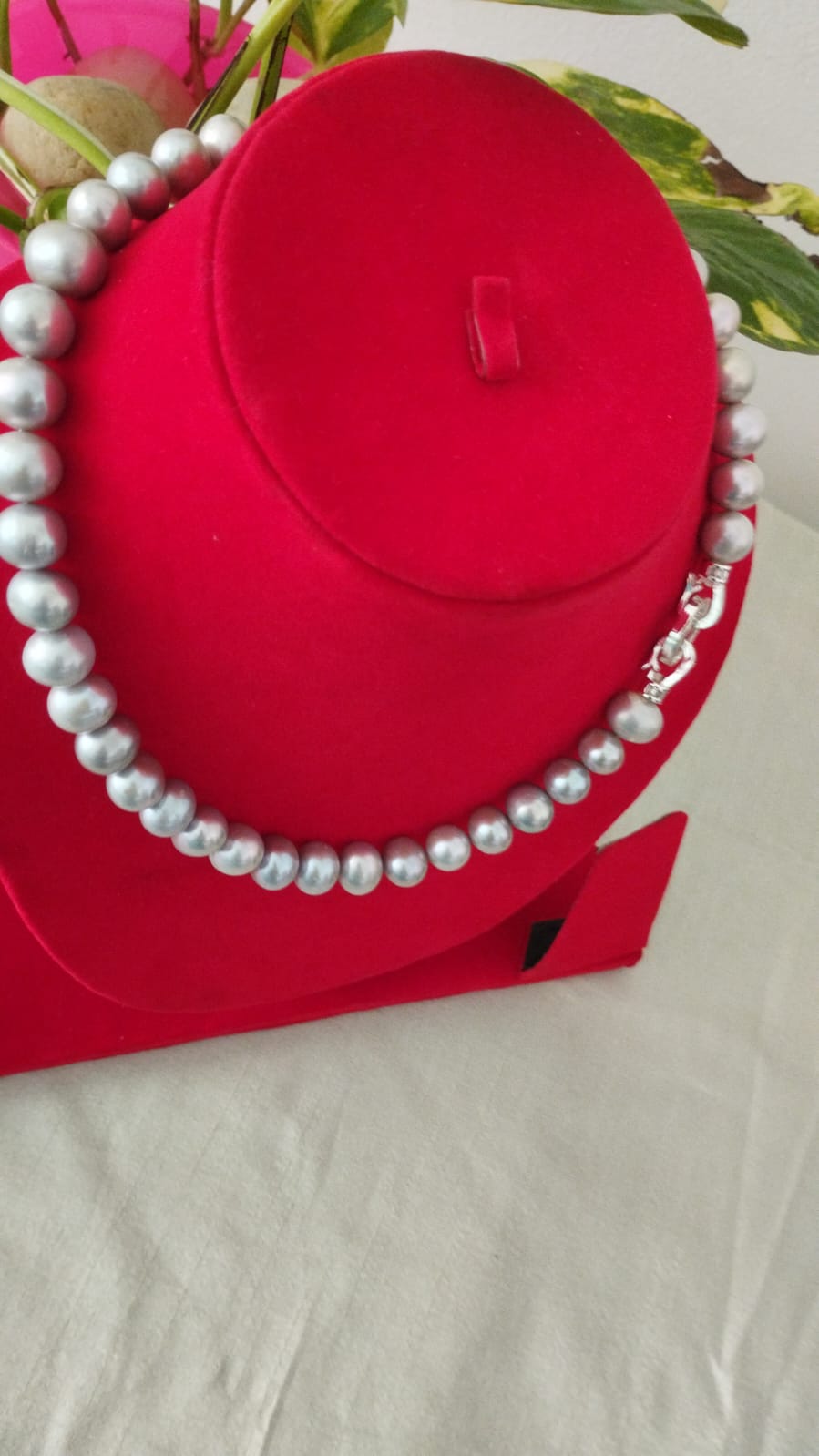 · The lustrous grey pearls are meticulously strung together, creating a harmonious flow that gracefully adorns the neckline.