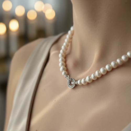 - Design: A single, graduated strand of natural freshwater pearls, secured by a sophisticated, rounded toggle or ring clasp encrusted with tiny crystals.